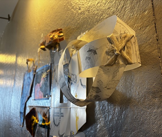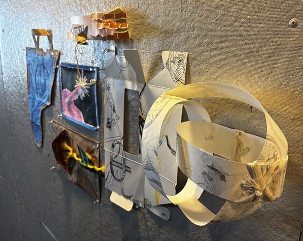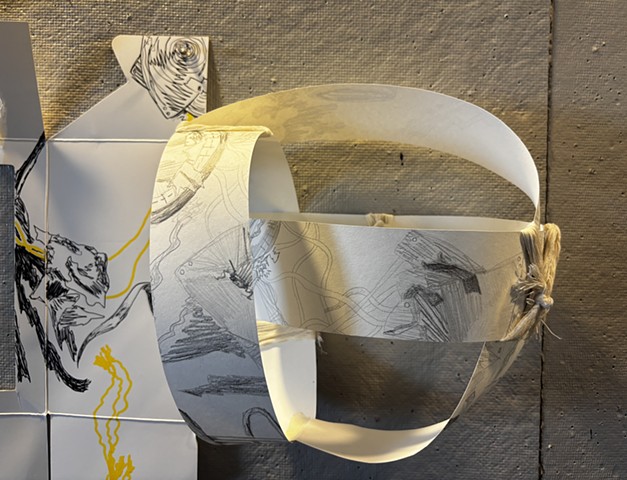 mixed media paper, graphite, macrame rope