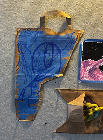 brown paper bag, blue painter tape, posca pen