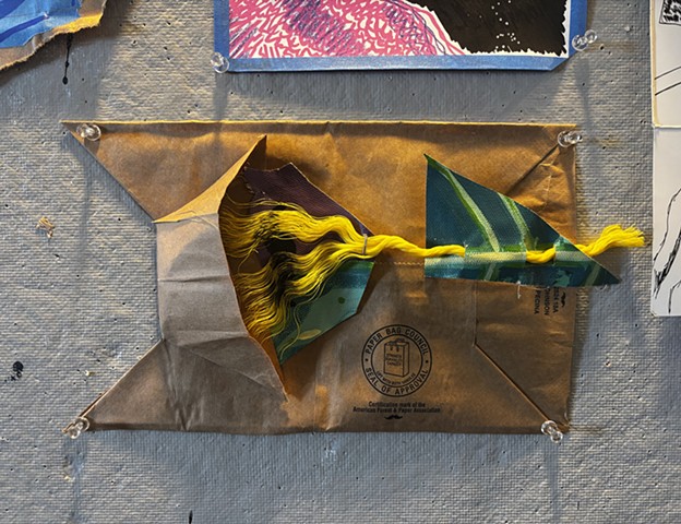 brown paper bag, painted canvas pieces, posca pen, micron pen, polypropylene rope