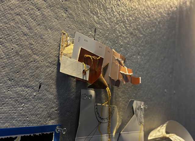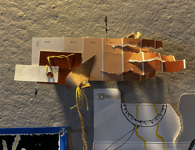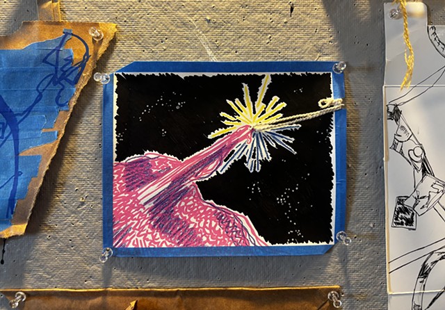 mixed media paper, blue painters tape, posca pen, colored pencil, twisted rope cord